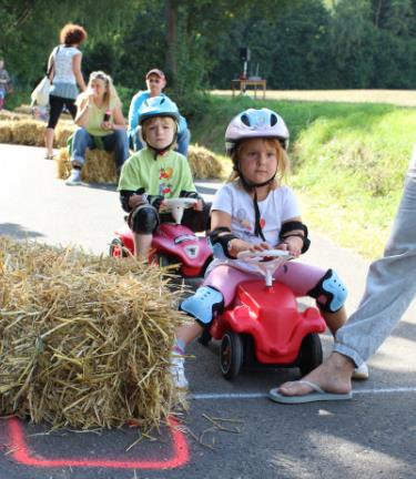 Rumpelnde Rollen, getunte Boliden und kreischende Fans und das alles bei strahlendem Sonnenschein. Immer wieder sausen die Plastikflitzer über den Asphalt, am Streckenrand feuern Eltern ihre Sprösslinge an. Startnummern, schwarz-weiße Zielfahne, sowie Grill-und Pommesduft statt Benzingestank. Am Jägerberg herrschte Stimmung wie auf dem Nürburgring:
