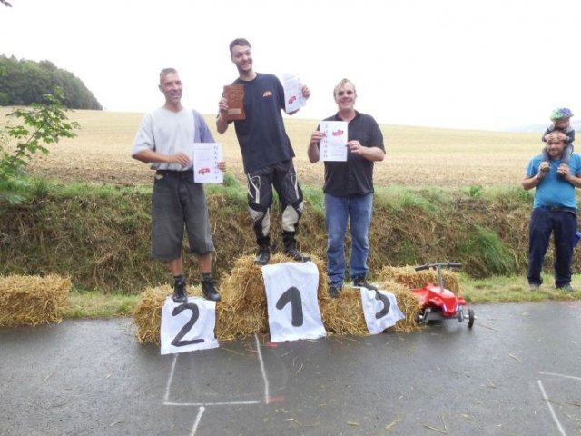 Als gegen 17.00Uhr ein Regenschauer über der Piste nieder ging, wurde die Siegerehrung kurzerhand unter die Bäume verlegt. Es herrschte Spannung im gesamten Fahrerlager und deren Fans, da es leider nur einen Sieger geben kann…